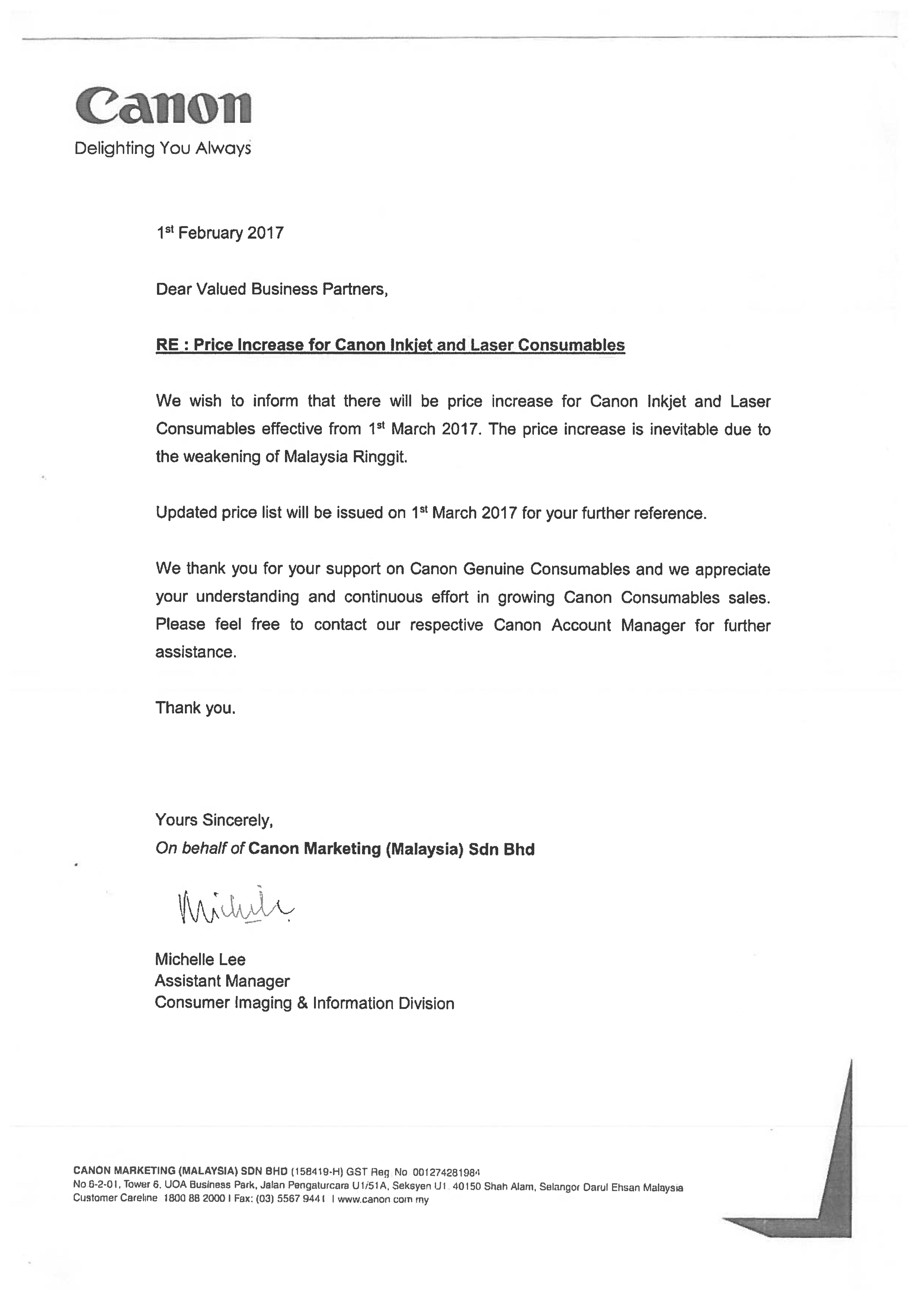CANON PRODUCT PRICE INCREASE 1ST MARCH 2017